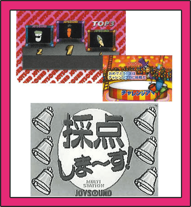 1996年、JOYSOUNDとして初の採点機能を搭載した「マルチステーション MX-03」を発売。歌が終わると、1000点満点で自動的に採点。紅白に分かれて得点を競う歌合戦スタイルや、上手に歌えないと鐘一つとともに曲が強制終了となるチャレンジモードなど、グループでのカラオケを盛り上げるツールとして定着していった。