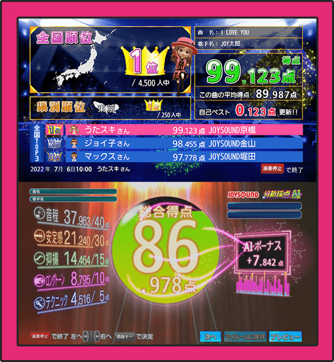 下:分析採点AI大人数で盛り上がるだけでなく、一人でもカラオケを楽しめる採点機能が充実。2022年には、膨大な歌唱データによって生み出されたカラオケ採点専用AIによる採点機能